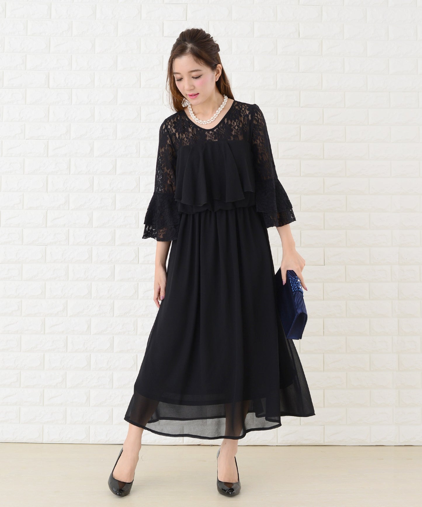 重くなりがちな黒のロングワンピースですが、