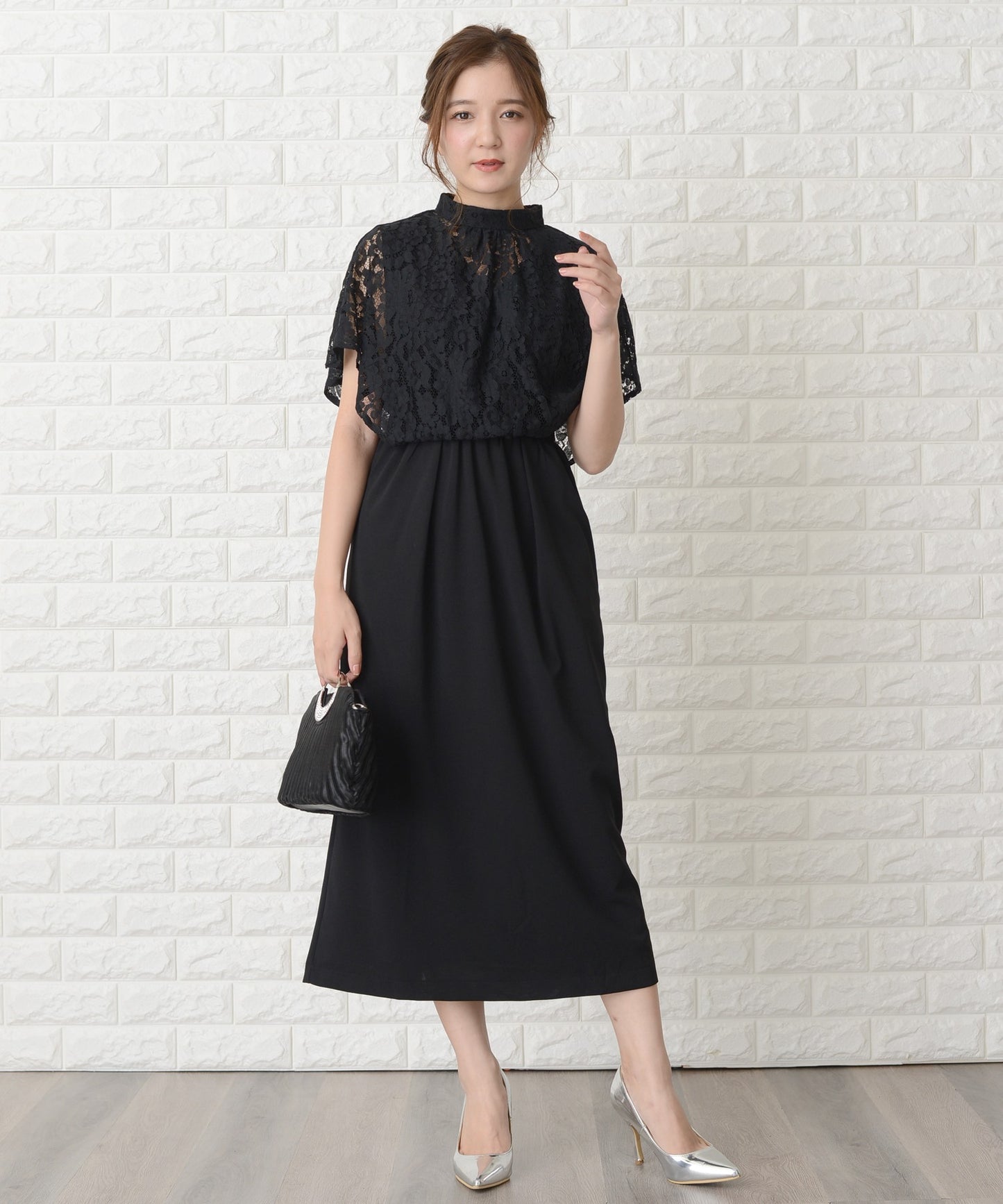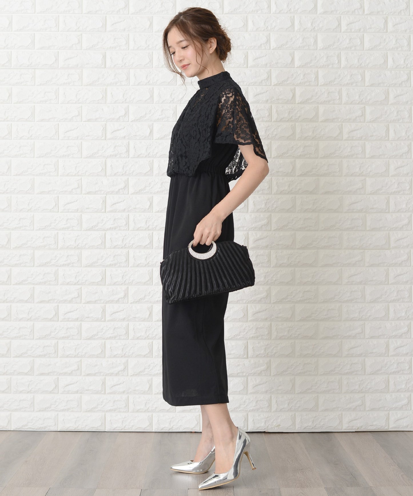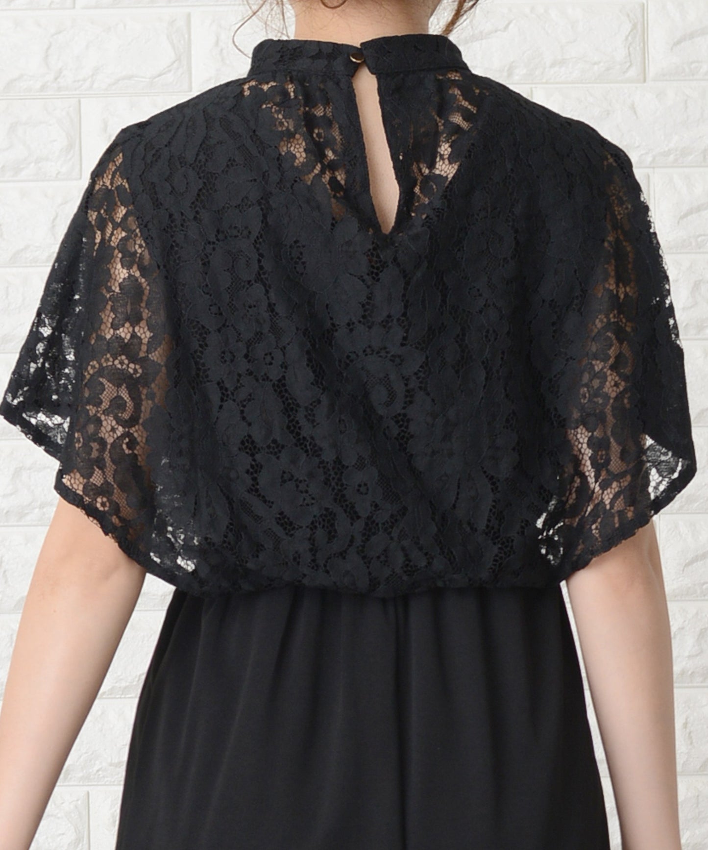 花柄レースIラインハイネックケープ風パーティードレス・ワンピース