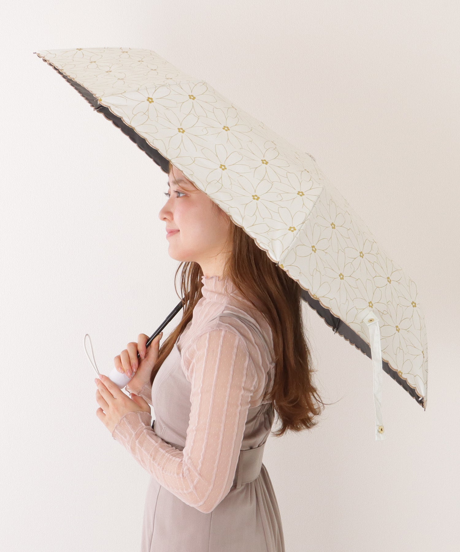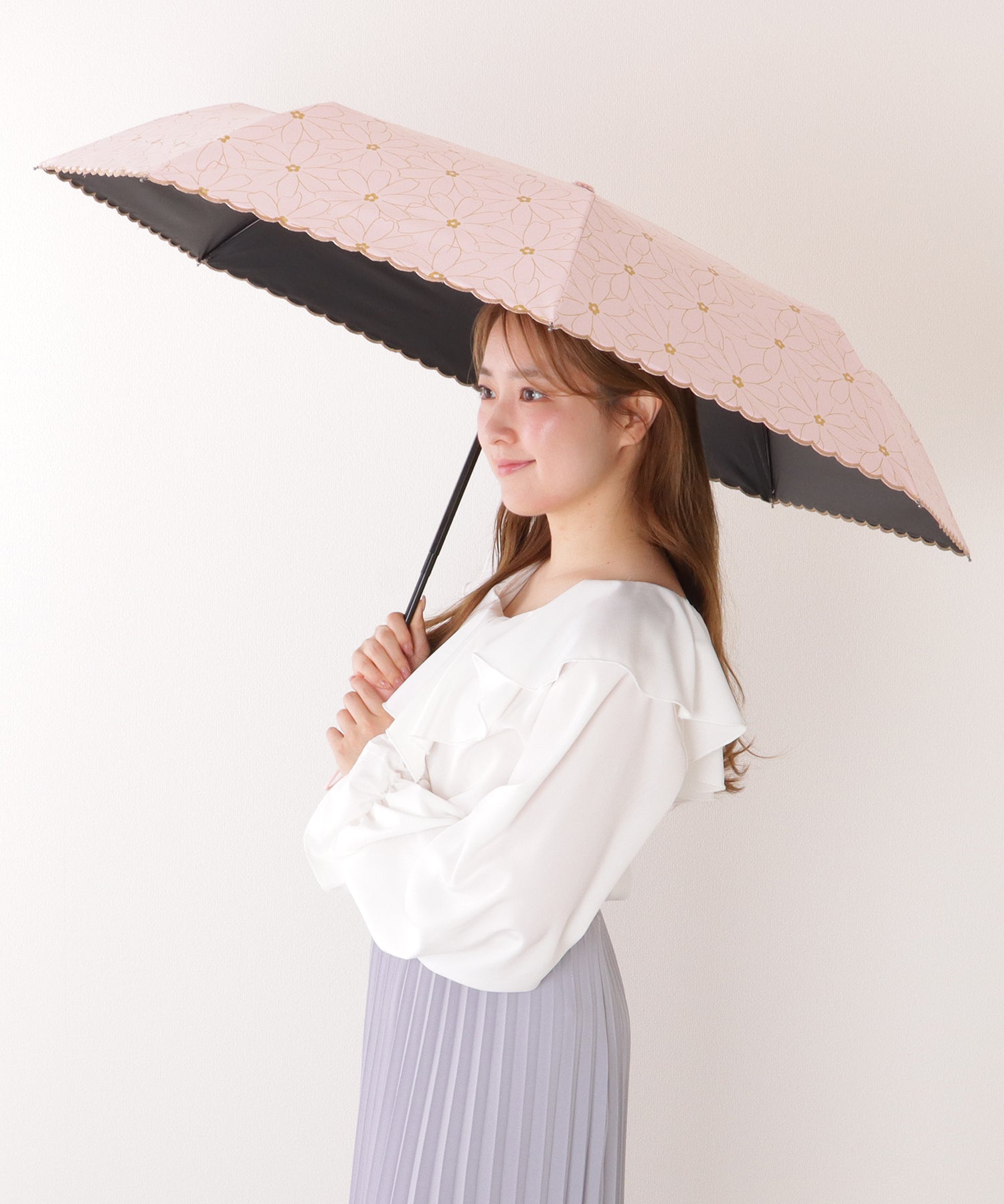 縁部分はまるで花びらのようなスカラップカットで、女性らしく華やかな表情に。