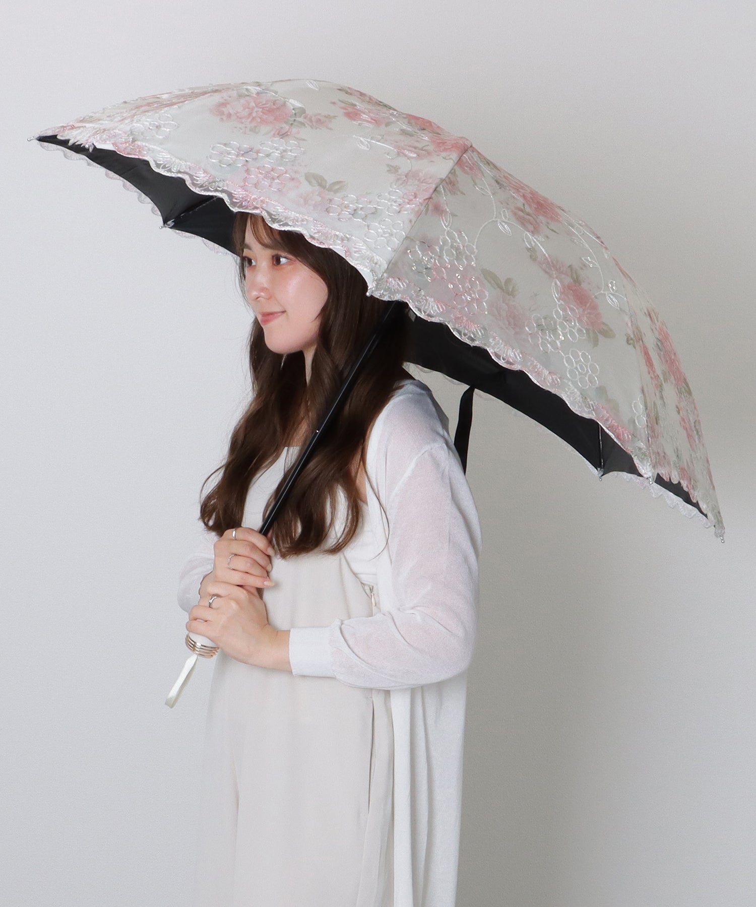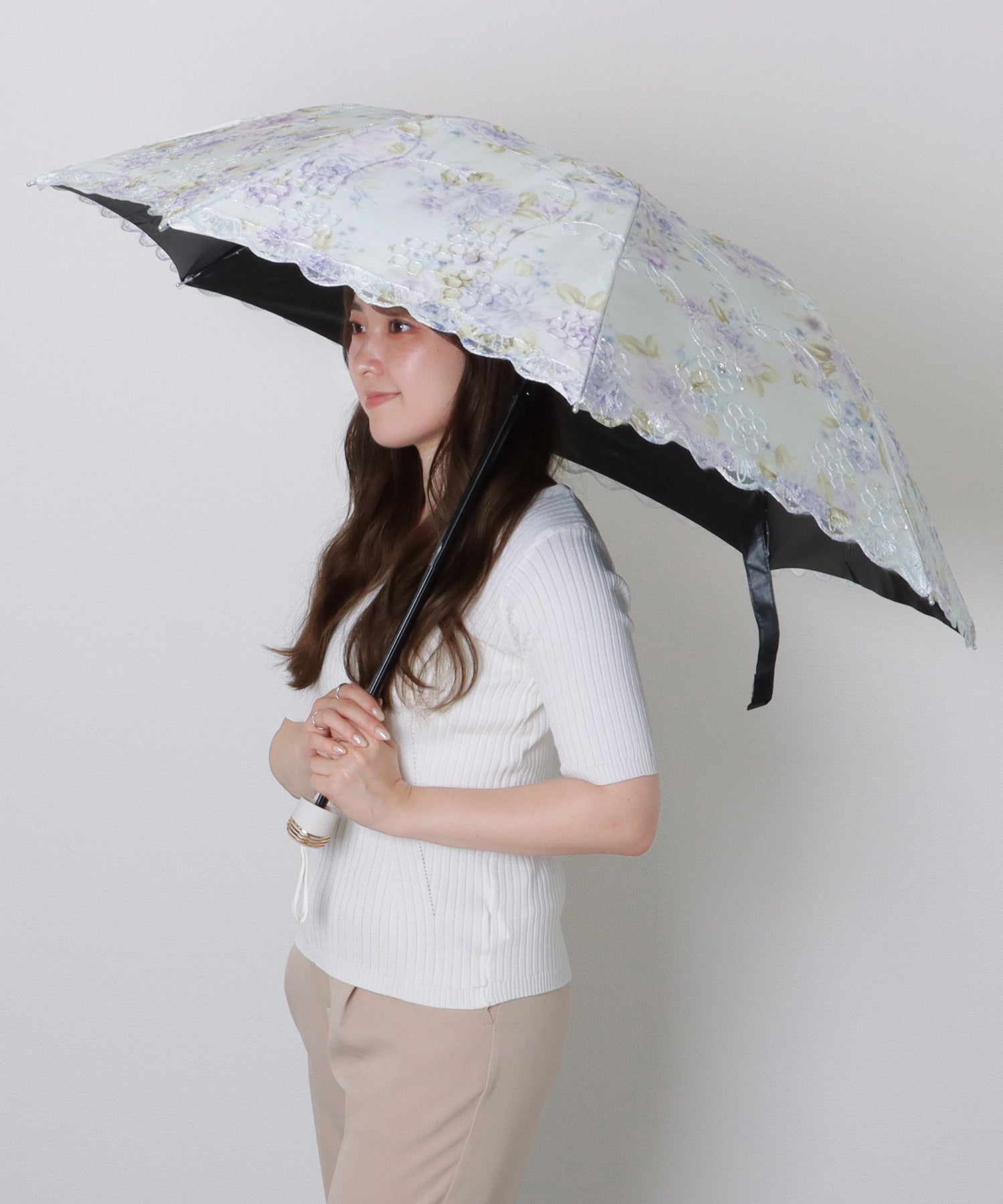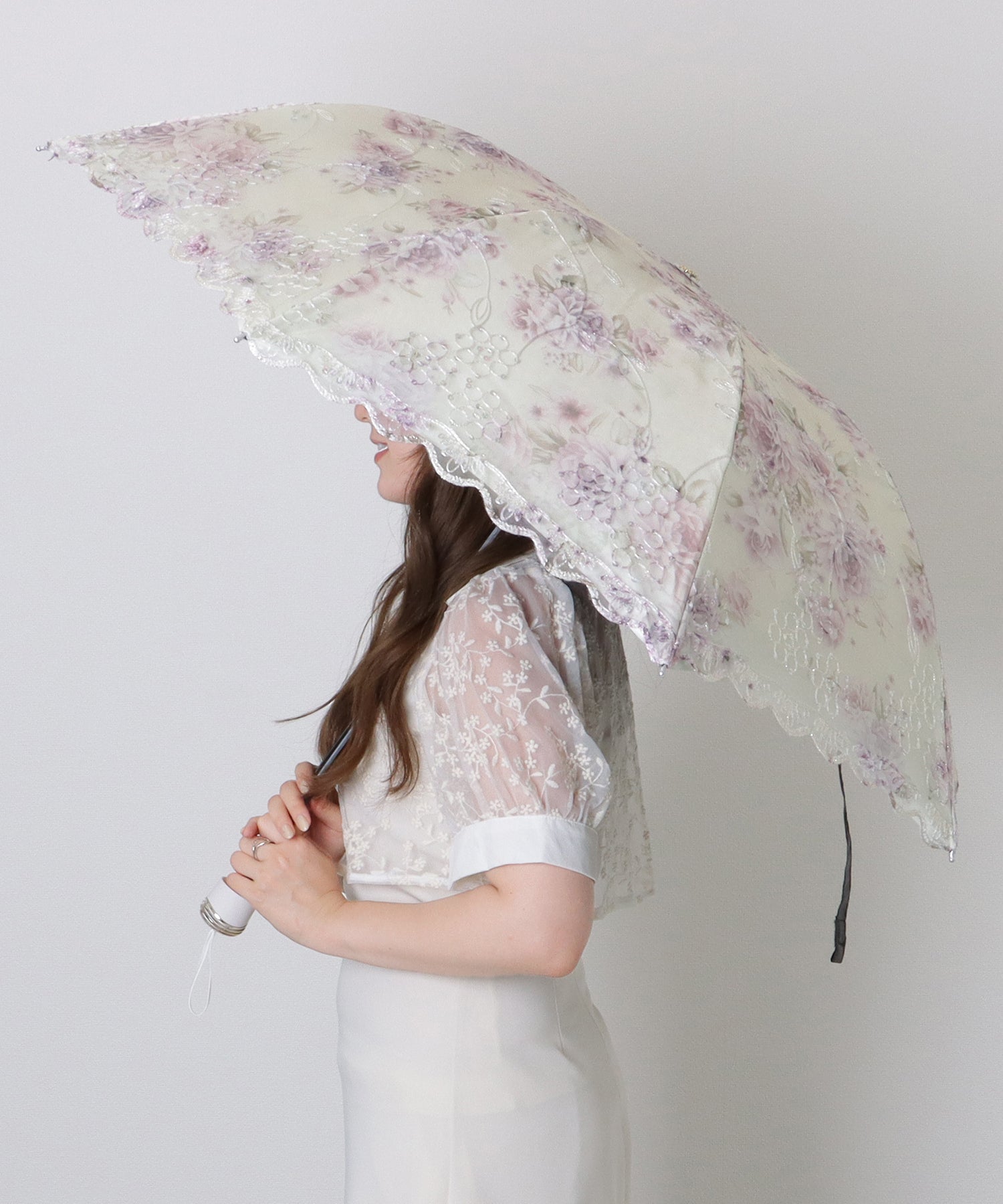 晴雨兼用 小花柄 刺繍 レース レイヤード 折りたたみ傘