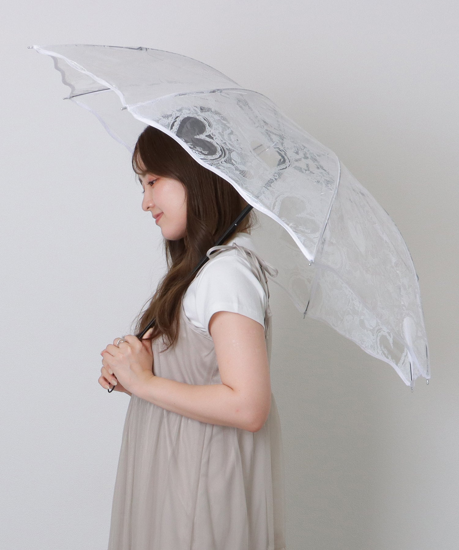 クリア素材にハートモチーフの柄をのせた、オシャレなデザインの折りたたみ傘。