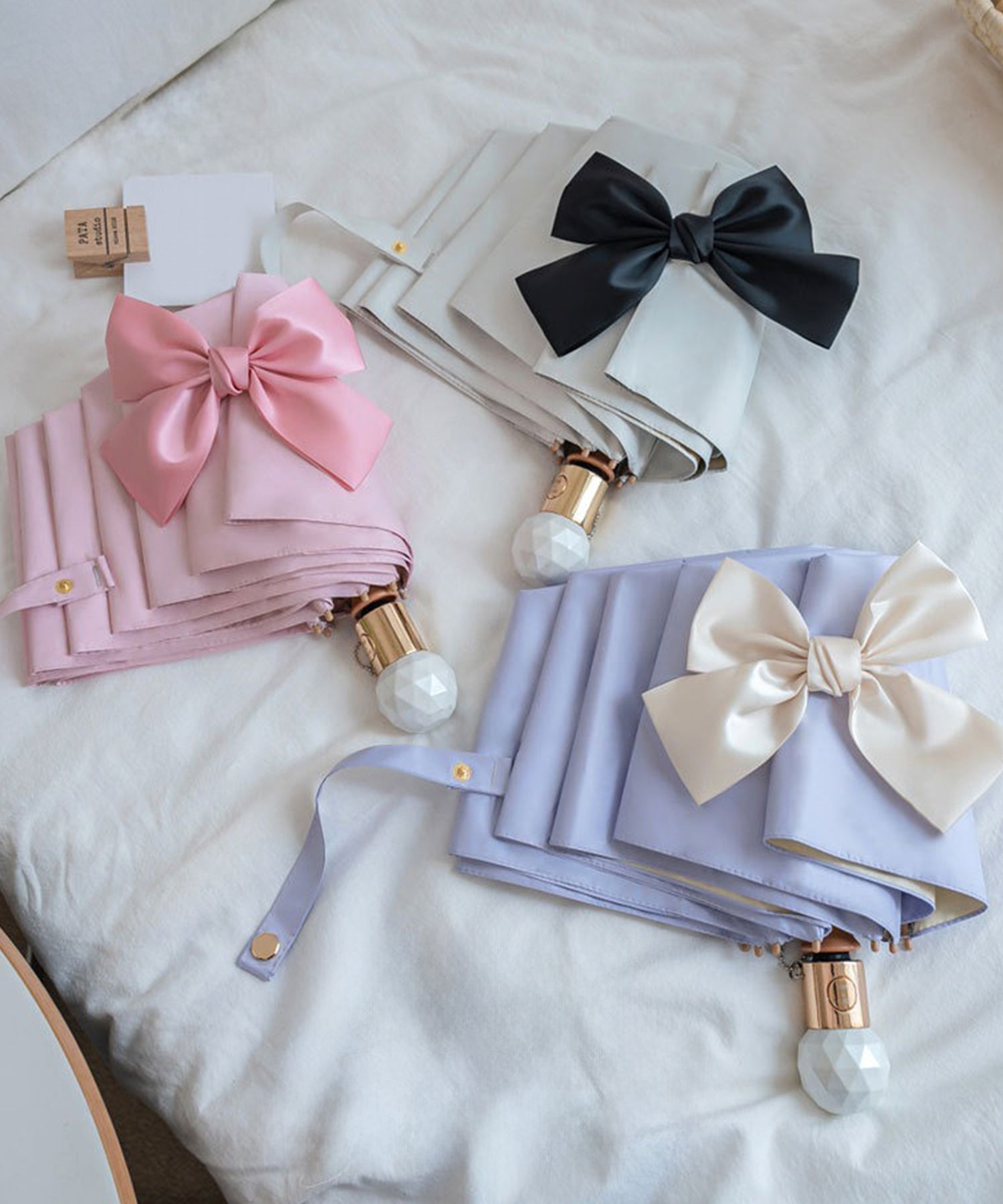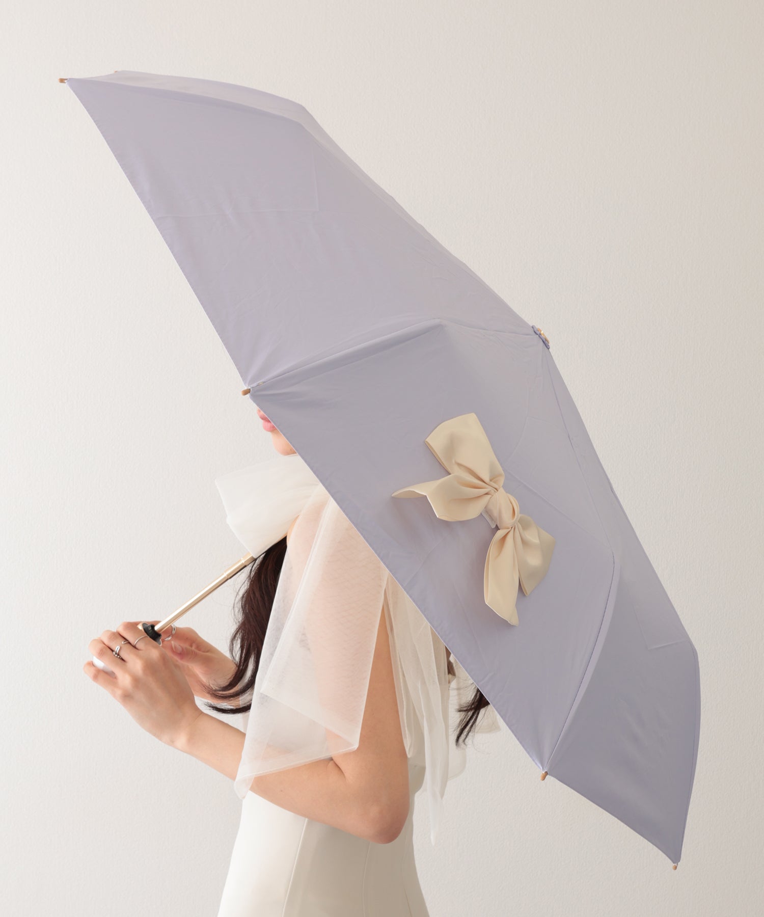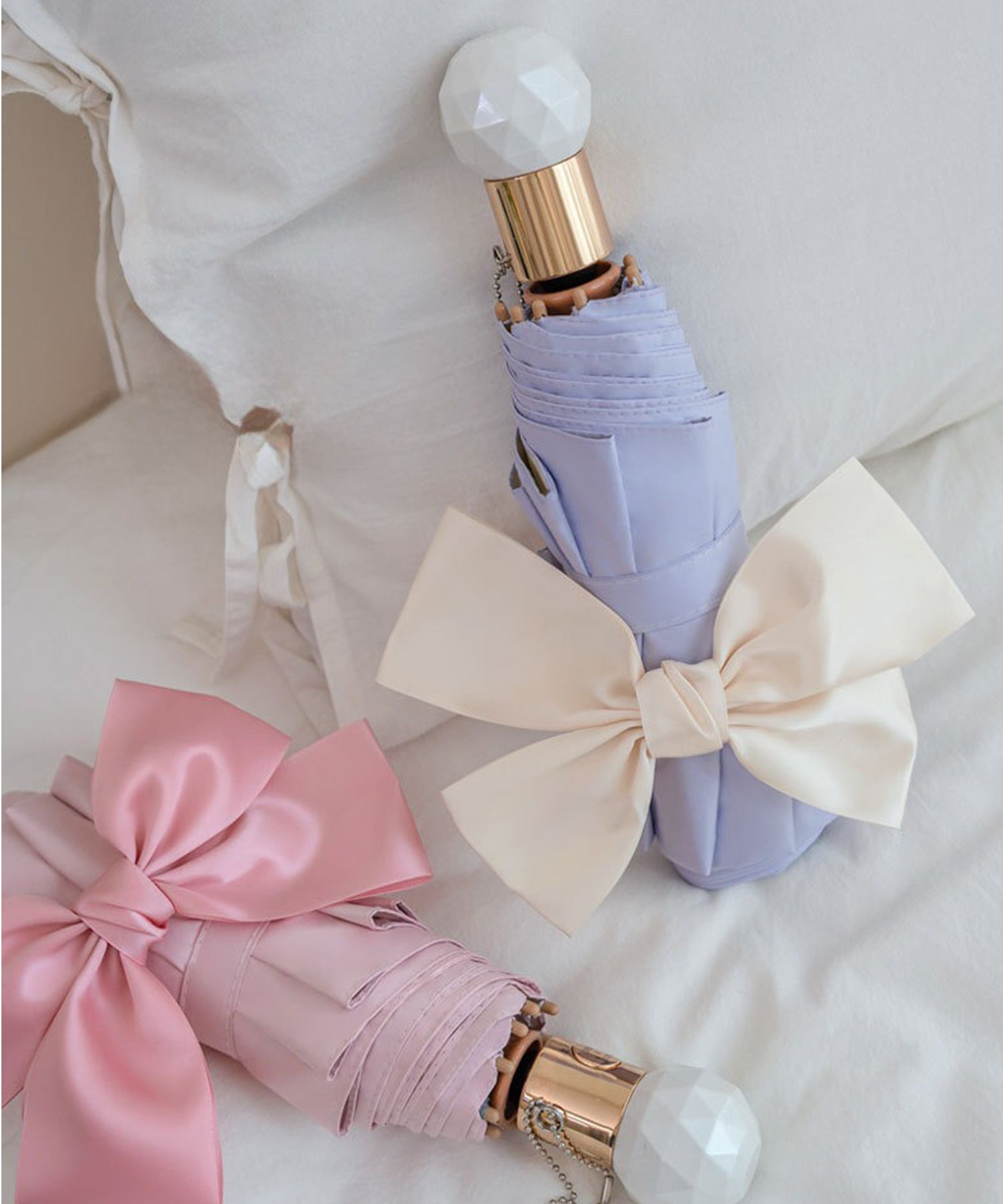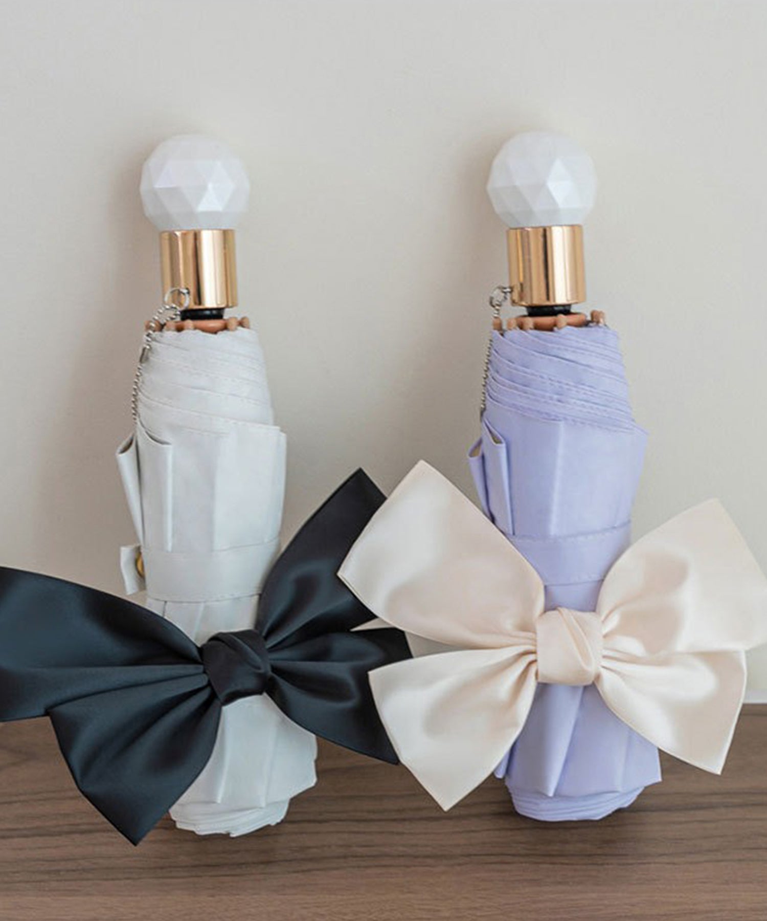 目を引く大きなリボンがアクセントになった、折りたたみ傘。