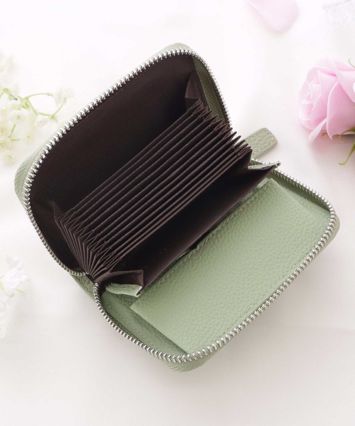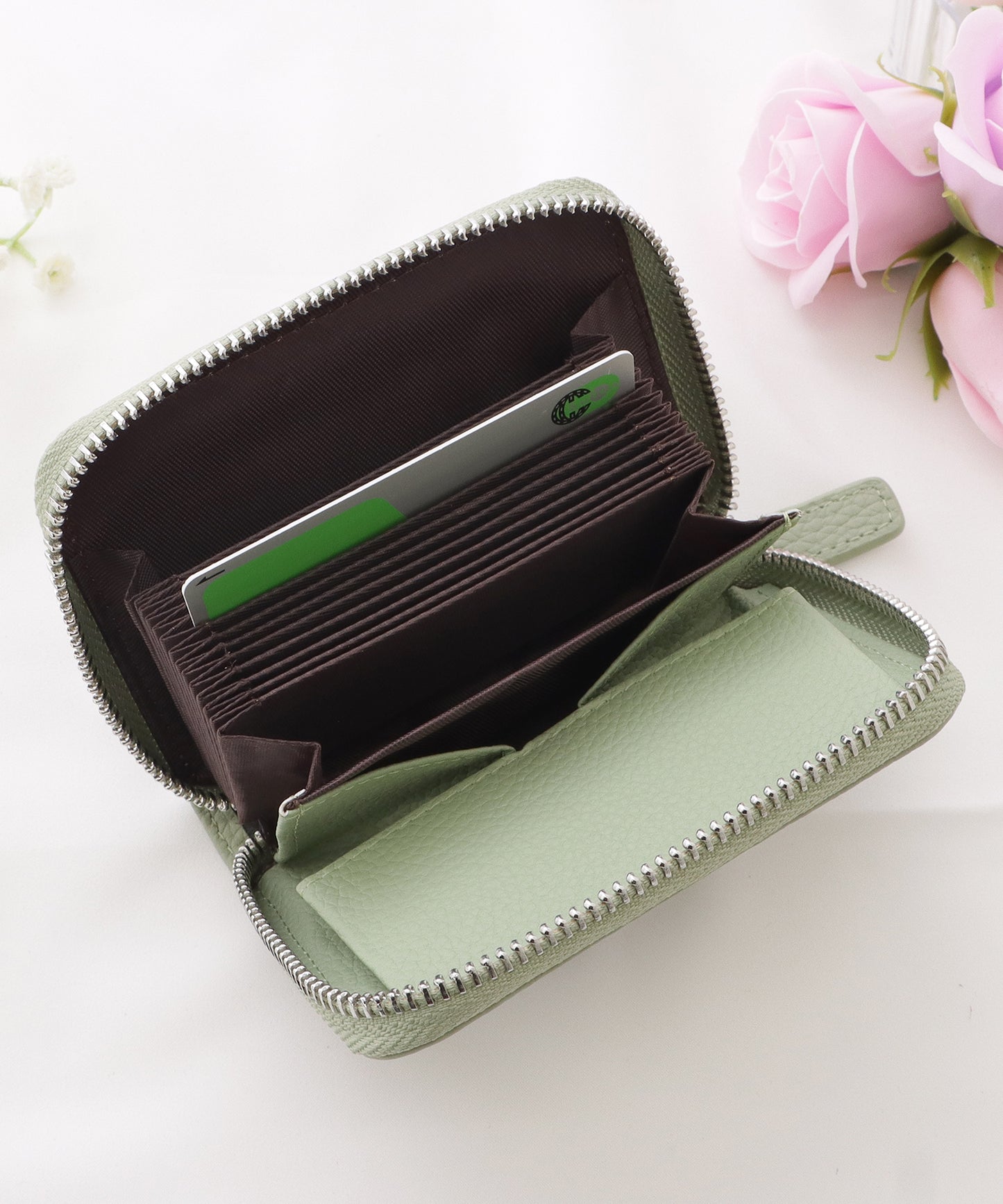 アコーディオン調に広がるたくさんのカードスロットやコインポケット、身分証明書専用のカードスロット、