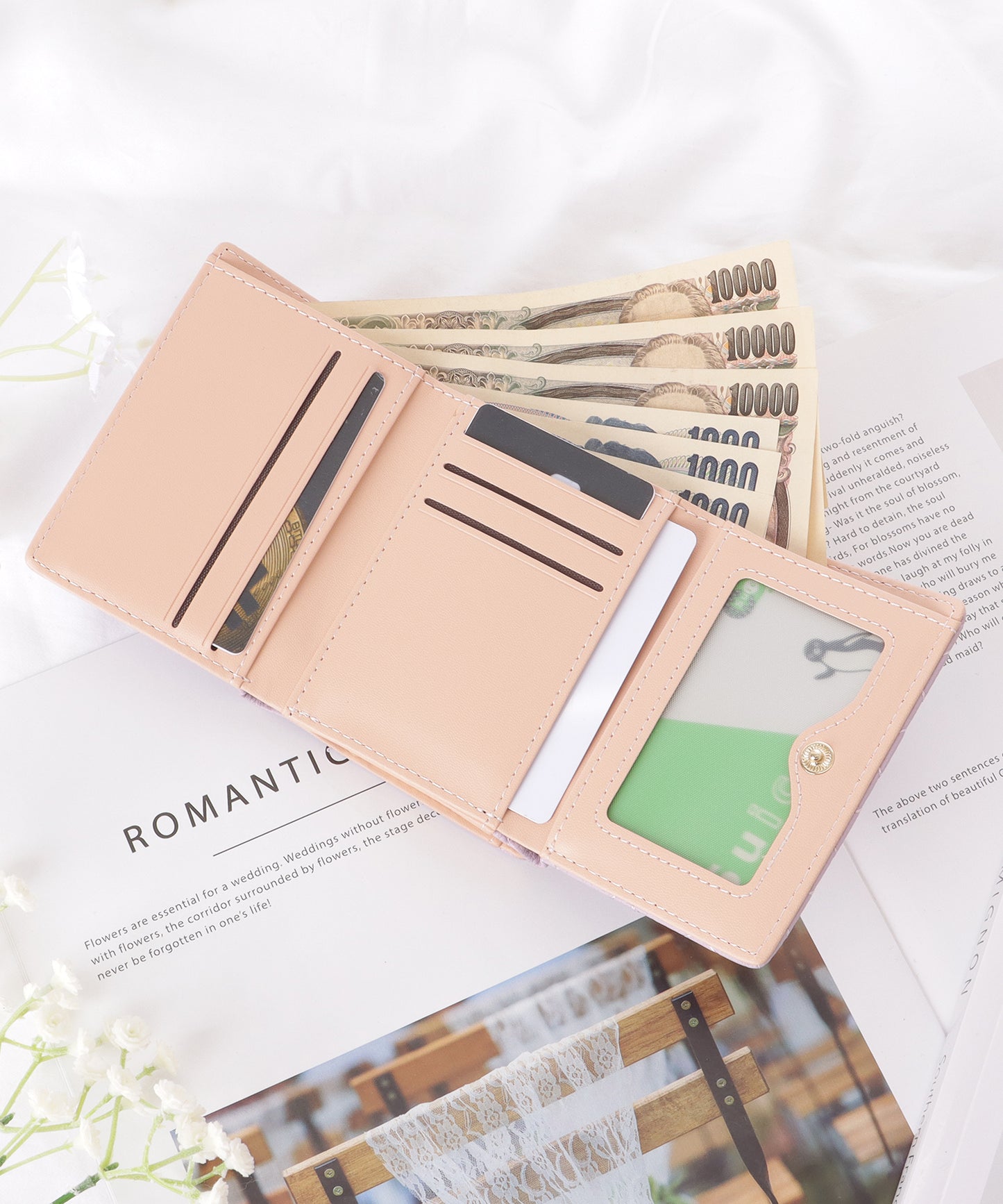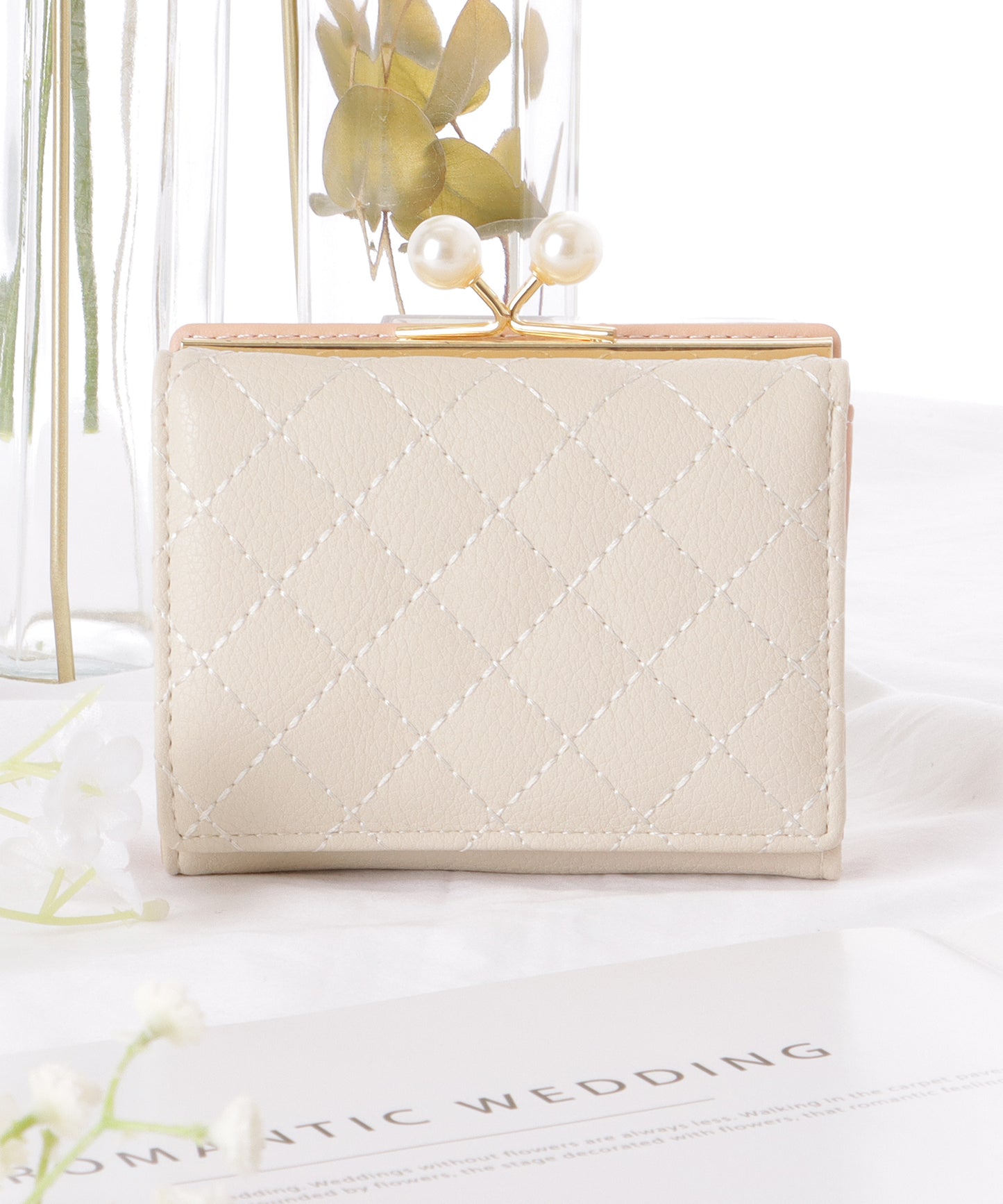レザー調生地にキルティングデザインが映える、上品な三つ折り財布。