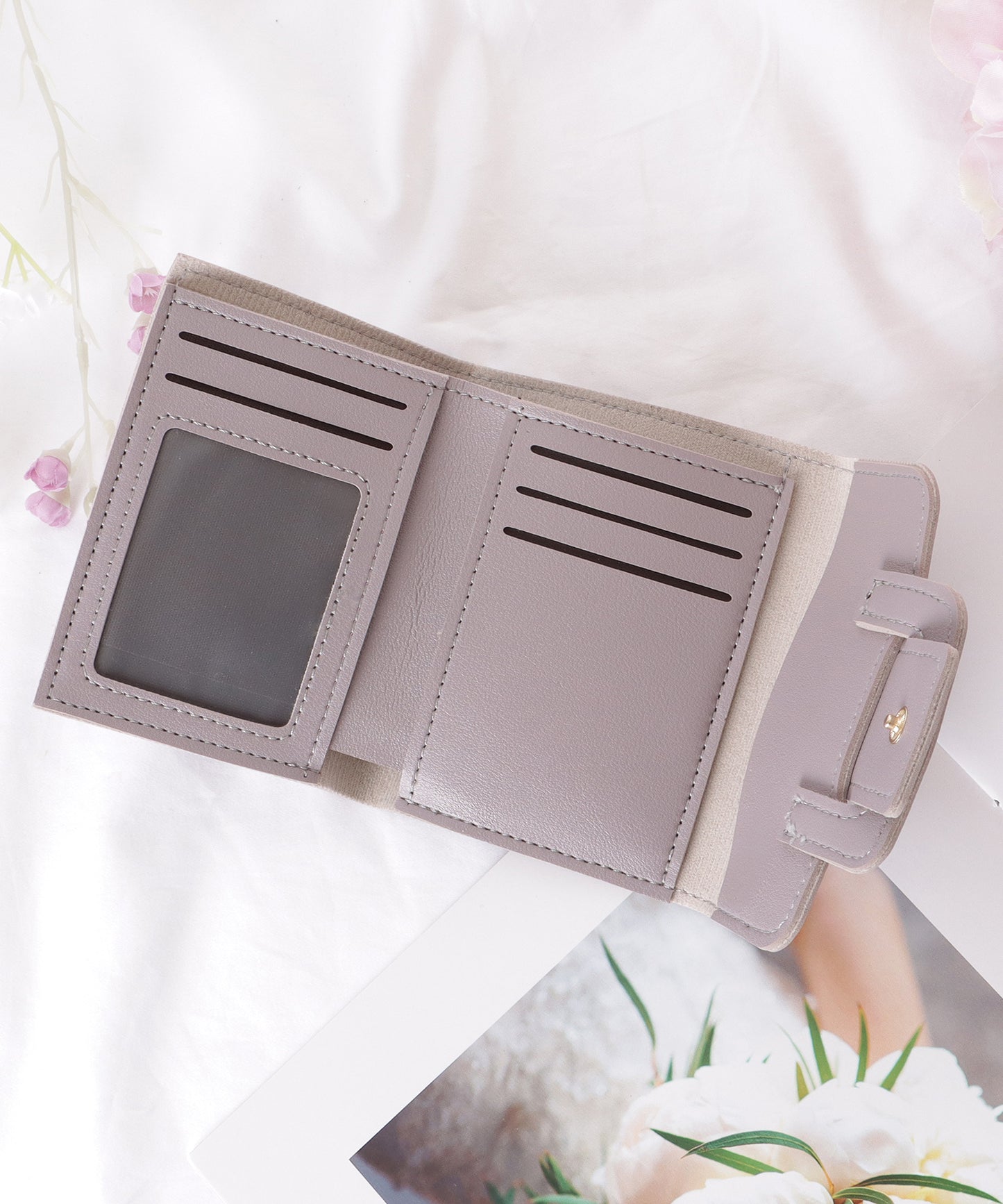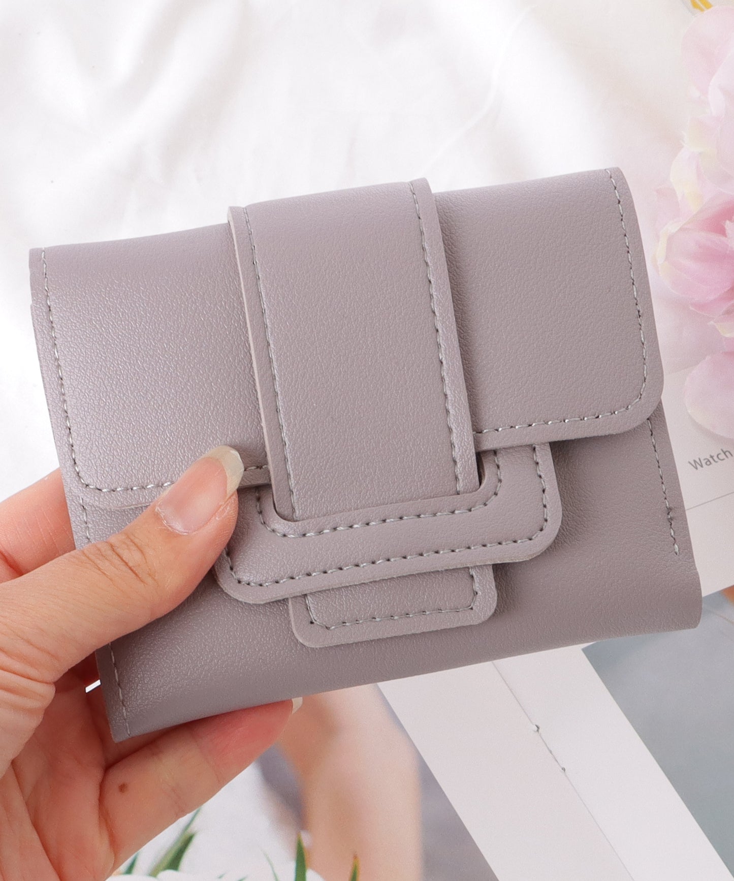 すっきりとしたスクエアフォルムの三つ折り財布。