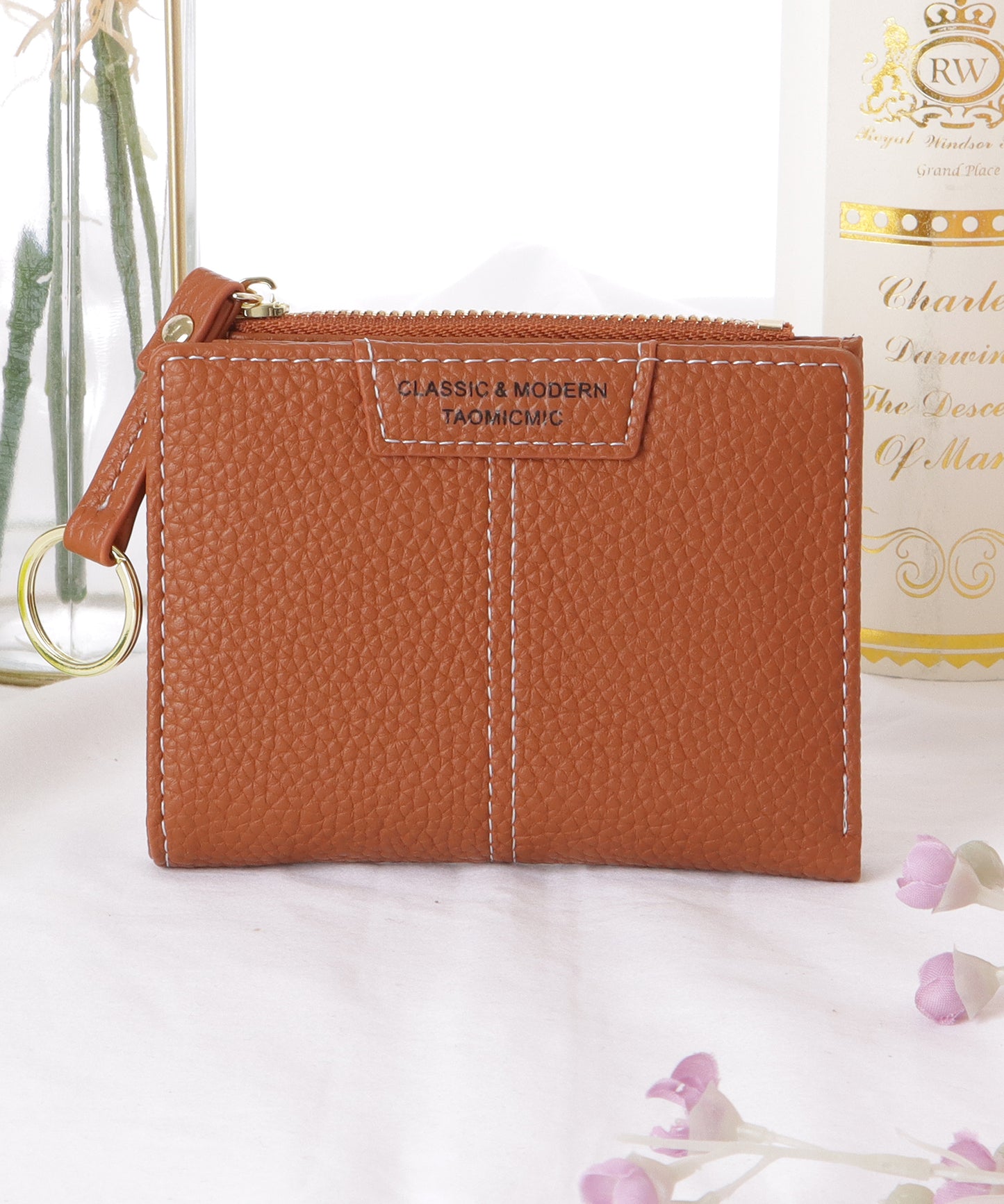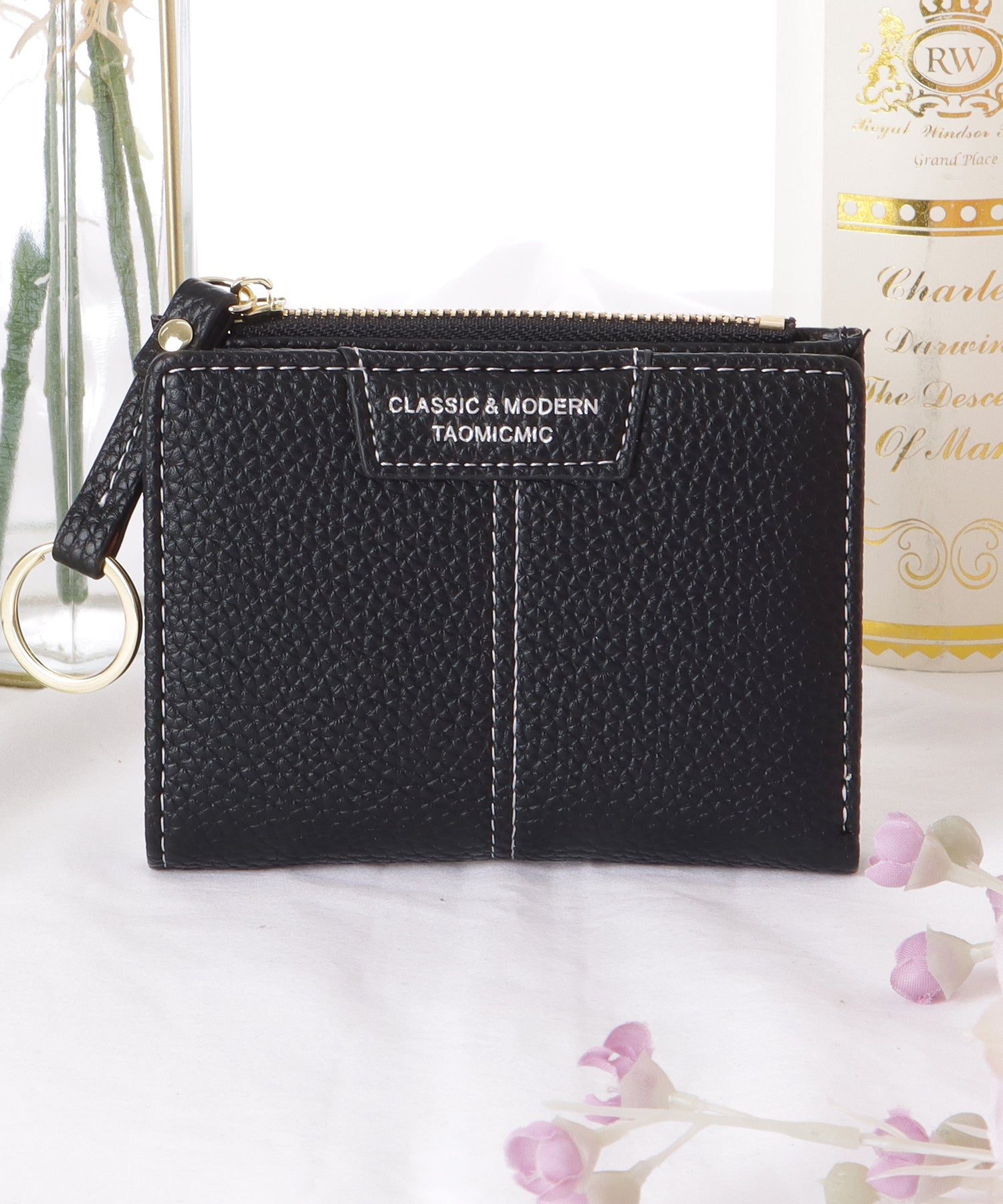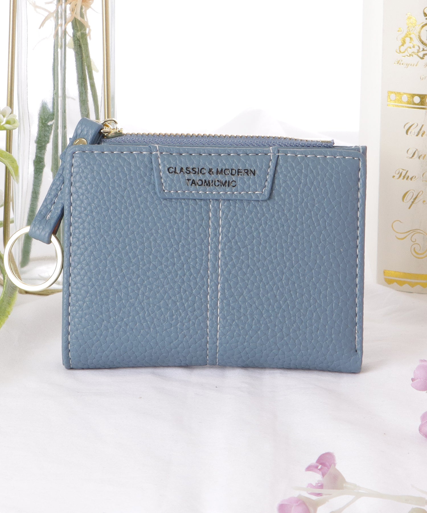 素材感のあるレザー調生地が、上品な佇まいの二つ折り財布。