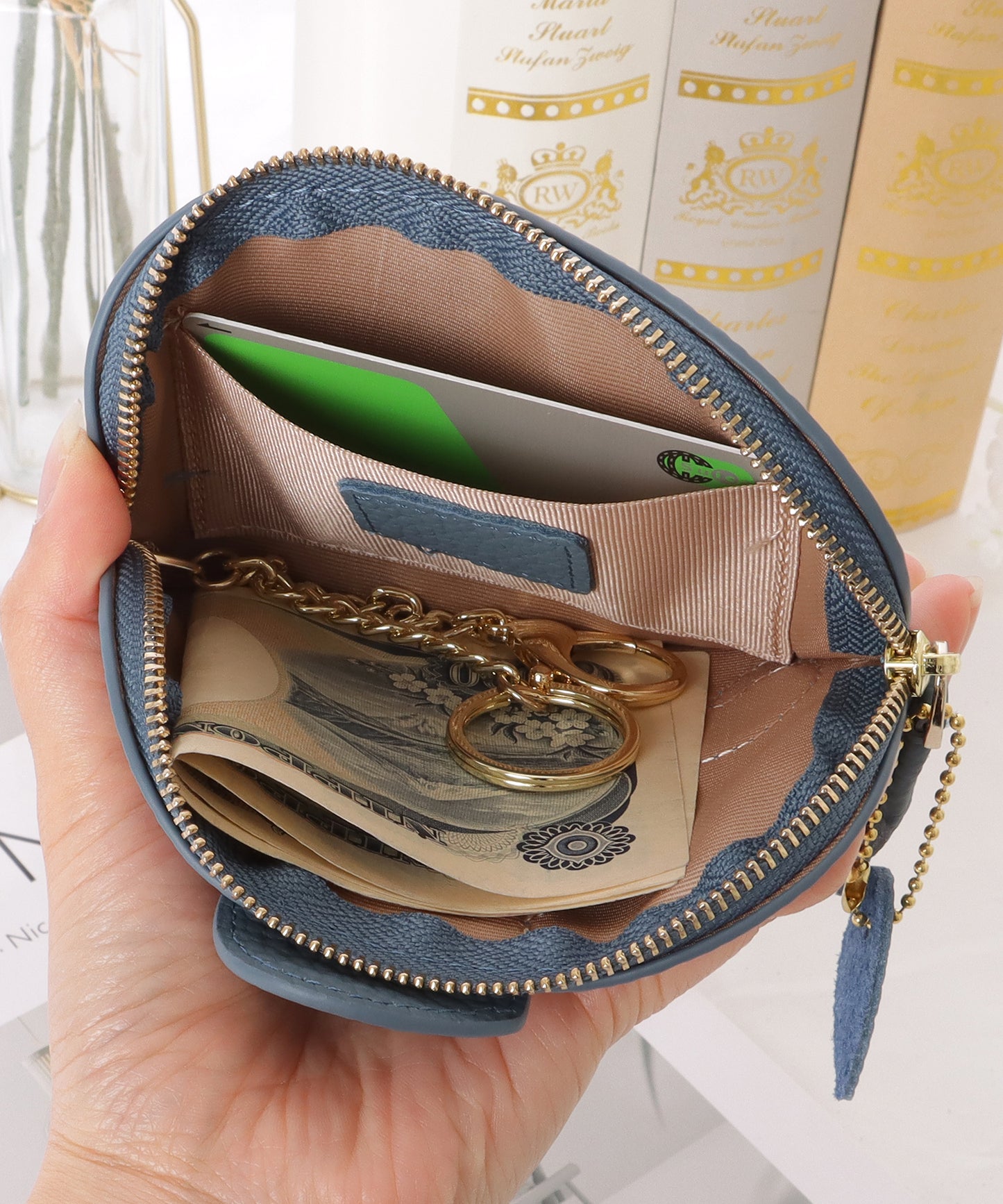 メインポケットの中には、ちょっとしたカードが収納できる仕切りと、2つのキーリングをセットしました。