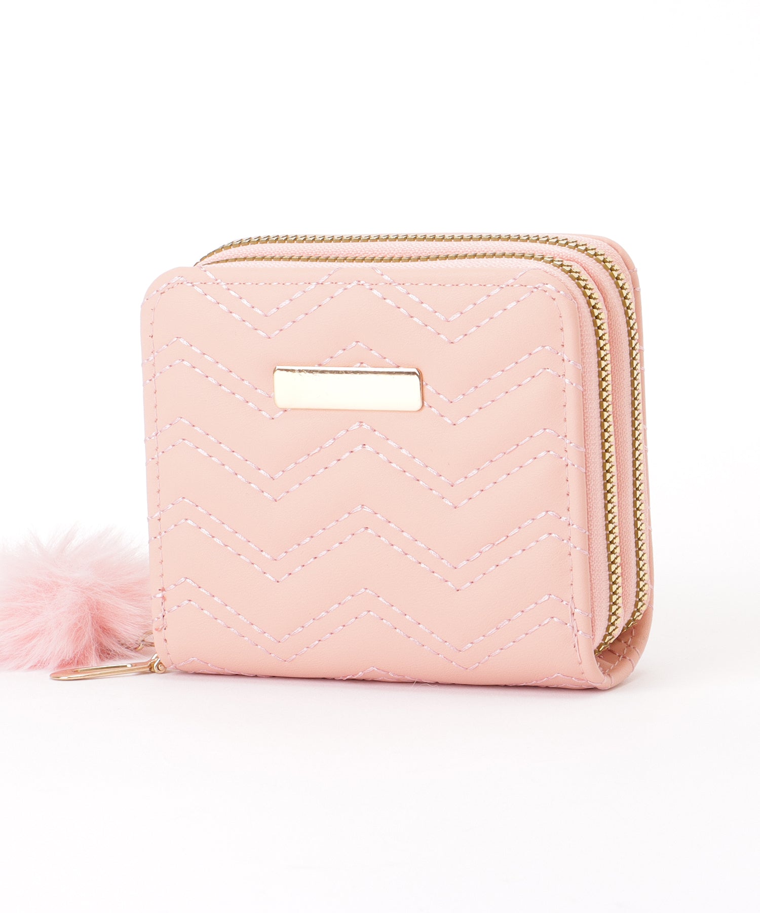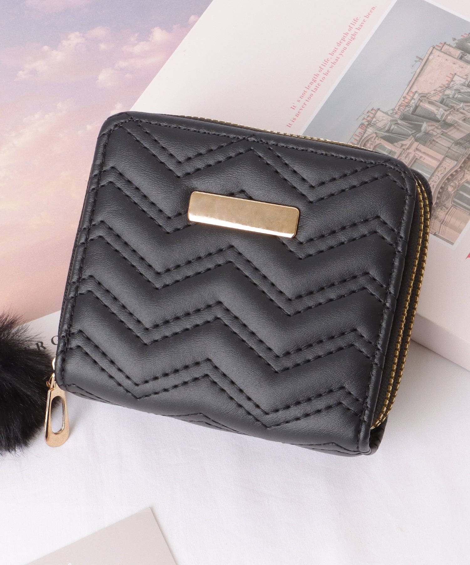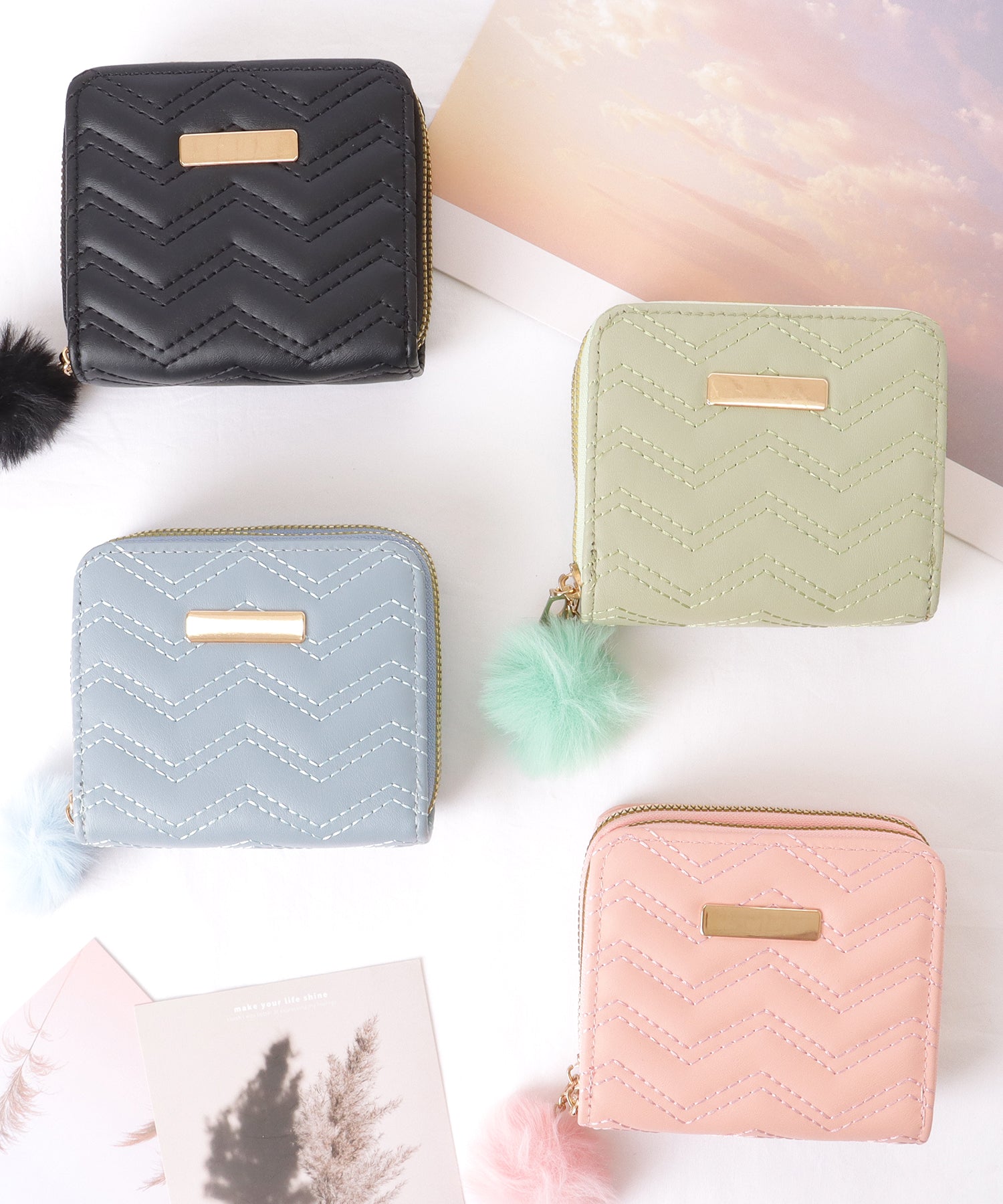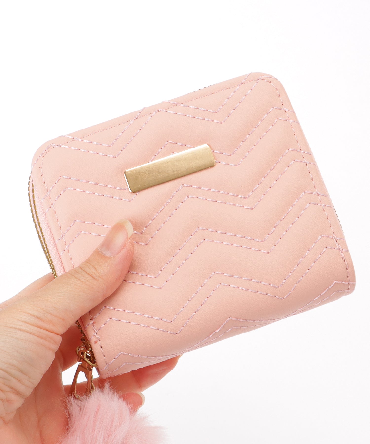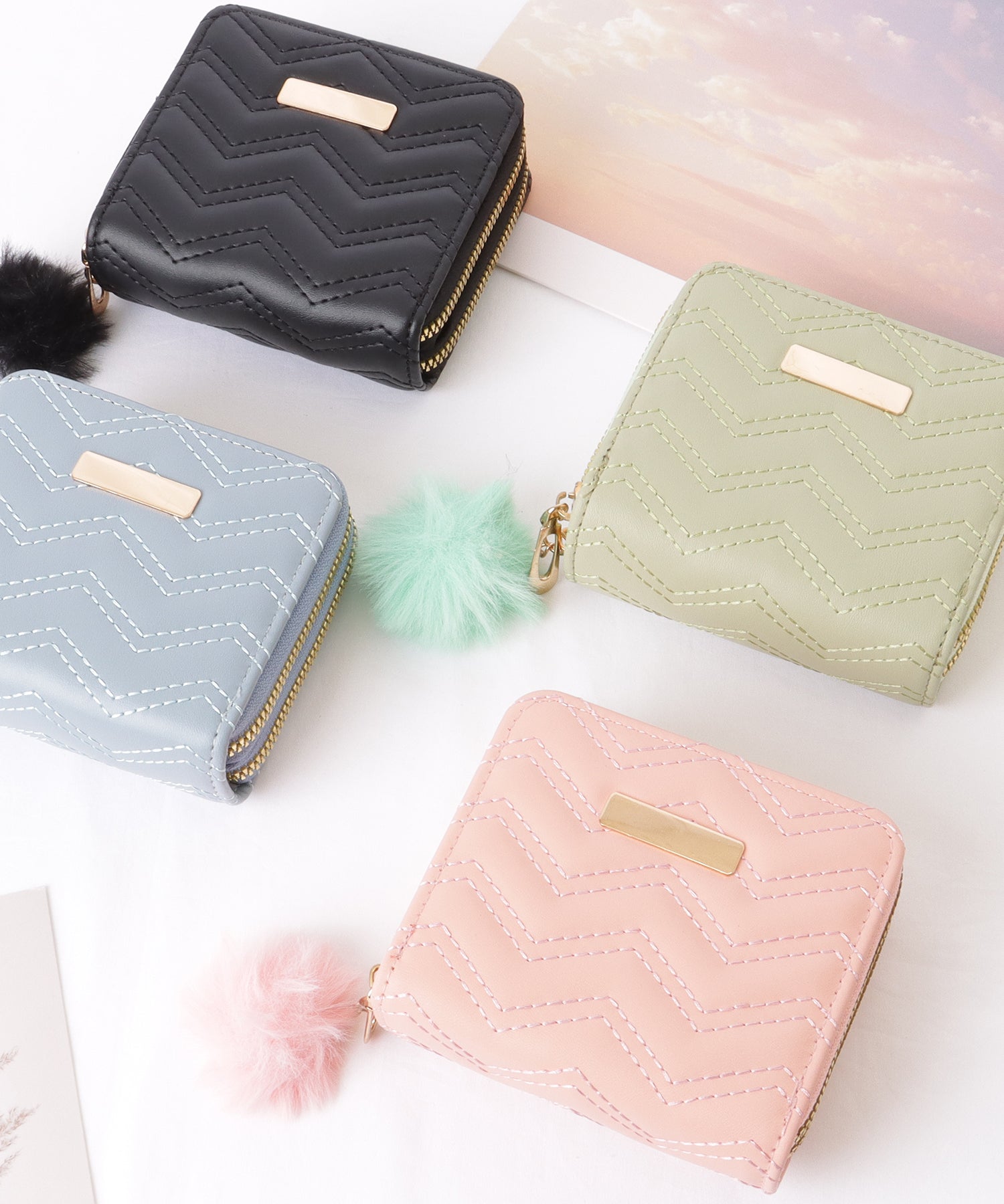 ファー チャーム付き ジグザグ ステッチ コンパクト ウォレット