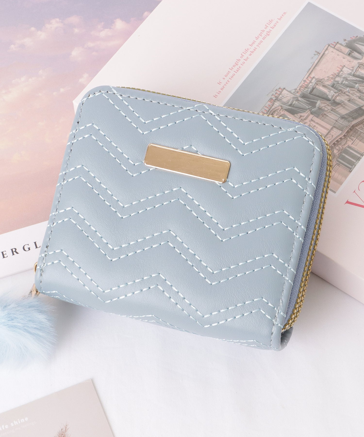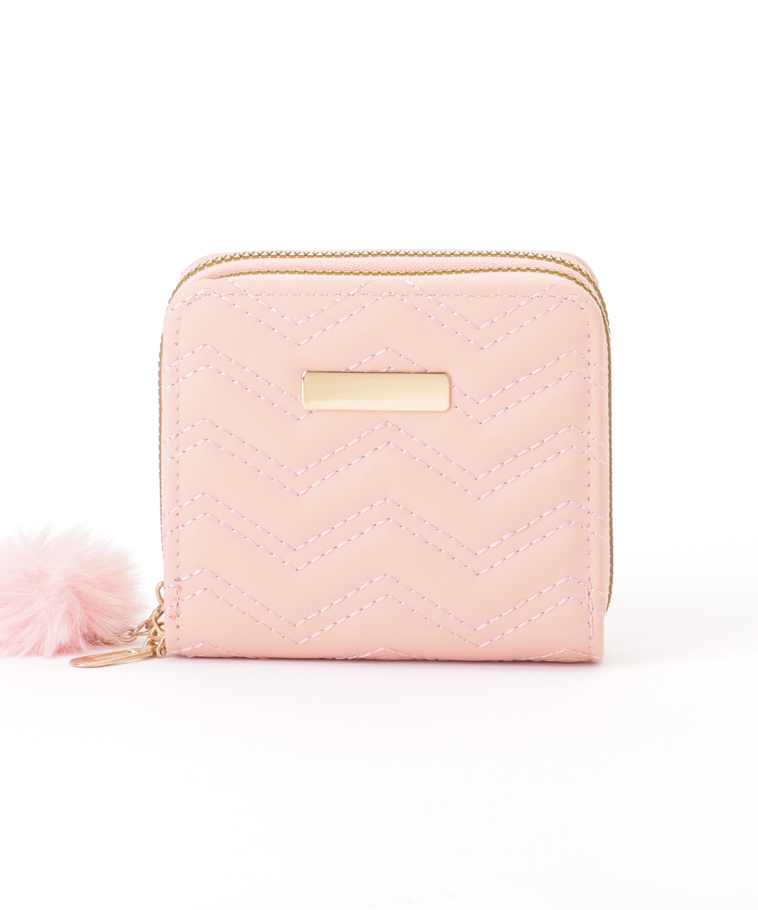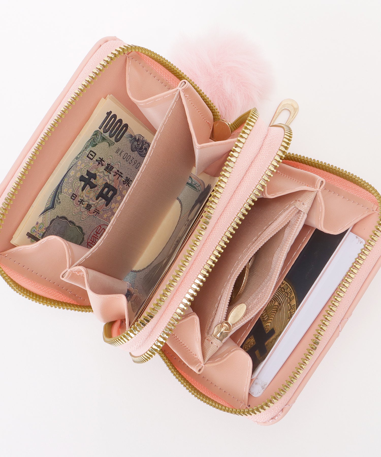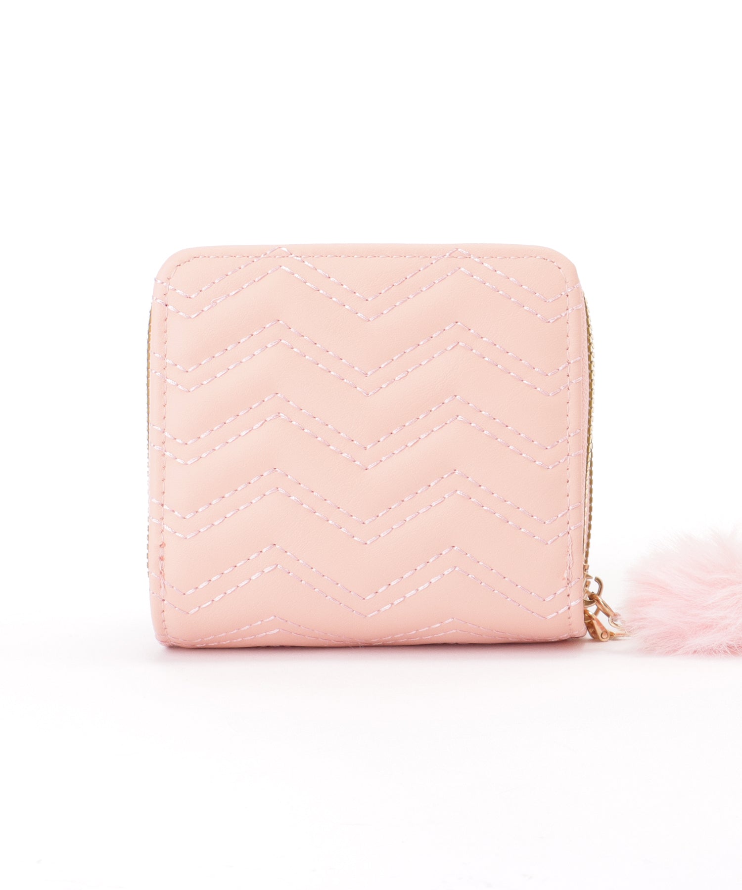 ファー チャーム付き ジグザグ ステッチ コンパクト ウォレット