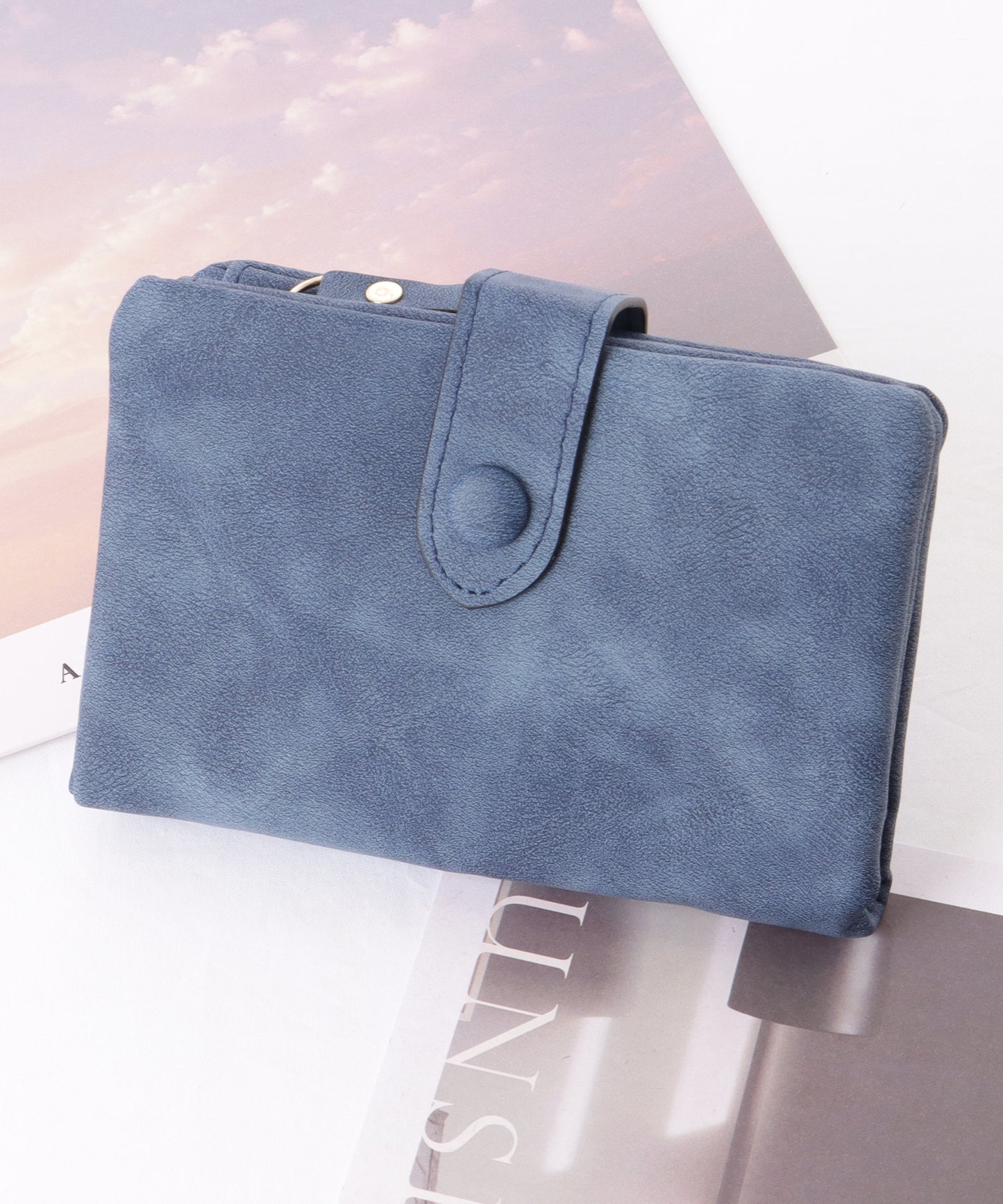 コンパクトに持ち歩きのできる二つ折り仕様で、素材感を揃えたくるみボタンのアクセントがとってもオシャレ。