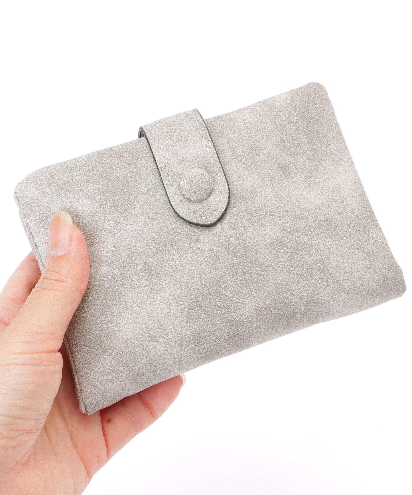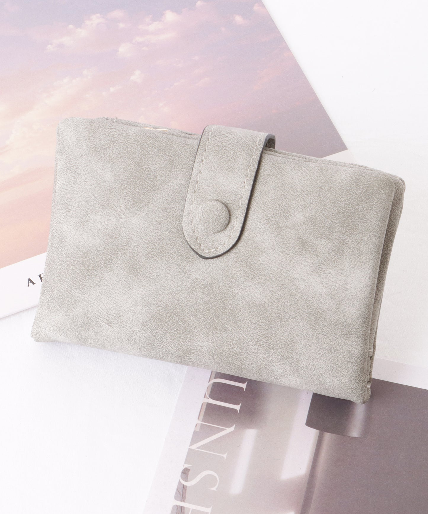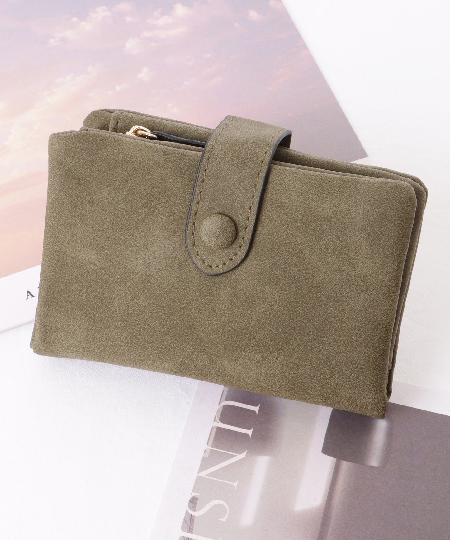 スエード調のマットな合成皮革素材を採用し、上品な佇まいに仕上げた財布。